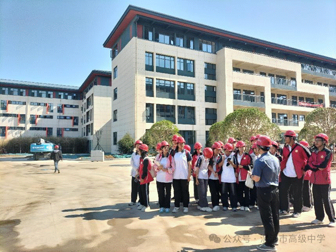 抵达西校区东门,施工方严格遵守安全规范,为学生们发放安全帽。漯河市高级中学西校区建设代表、总务处副主任张永辉现场客串导游,为同学们详细介绍学校概况与建设进度。“作为市委市政府重点打造的七大民生工程之一,漯河高中西校区自2024年4月启动以来便锚定‘中原名校、全国一流’的办学目标进行高标准设计筹建。”张永辉介绍道,“西校区占地443.8亩,位于美丽的澧河与沙澧河联通工程交汇处,空中俯瞰犹如一柄玉如意,17栋现代化建筑错落有致,两大建筑群围绕图书馆蜿蜒曲折,犹如二龙戏珠。这里不仅有标准化的智慧教室、双轨餐厅、实验室、图书馆、综合报告厅、文体中心等,还有配备恒温淋浴、上床下桌的宿舍,各类生活设施一应俱全。”