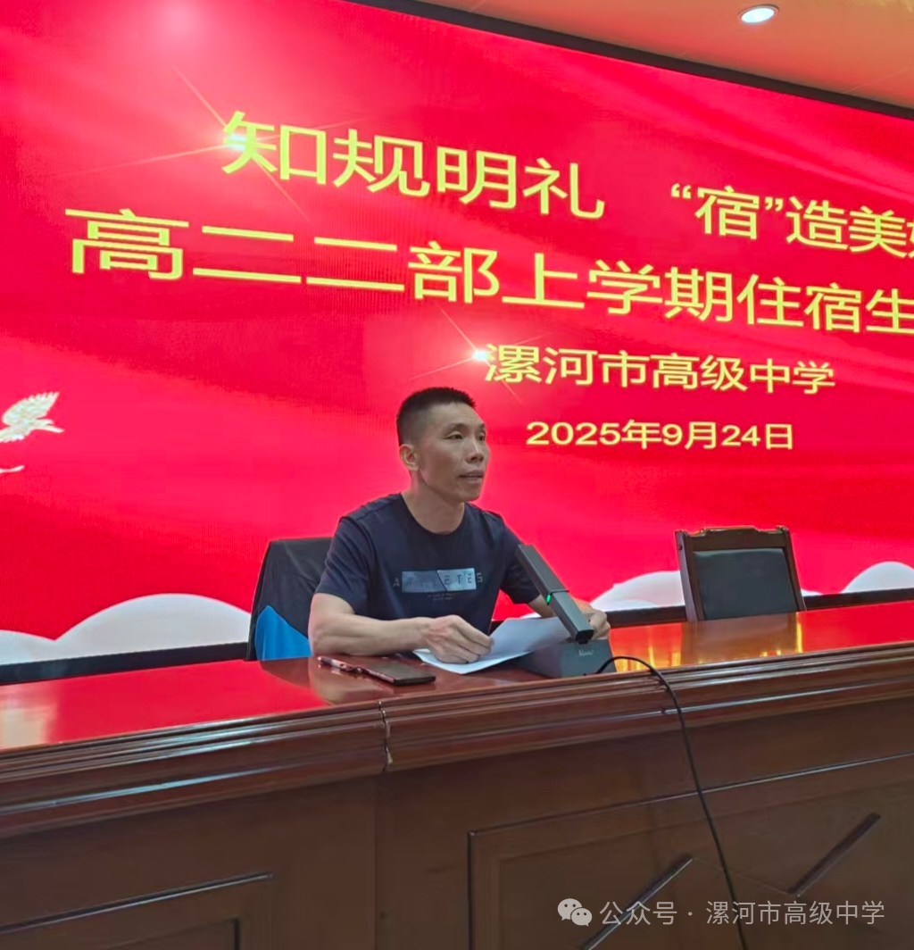 会议伊始,马建松老师郑重宣读了漯河高中住宿生宿舍管理办法,重点就宿舍卫生的标准与维护、文明礼仪在宿舍生活中的具体体现、请假的规范流程以及违规违纪的严肃处理办法进行了细致阐述,让全体住宿生对宿舍管理要求有了清晰且深刻的认识,为营造良好的宿舍环境筑牢了制度基础。