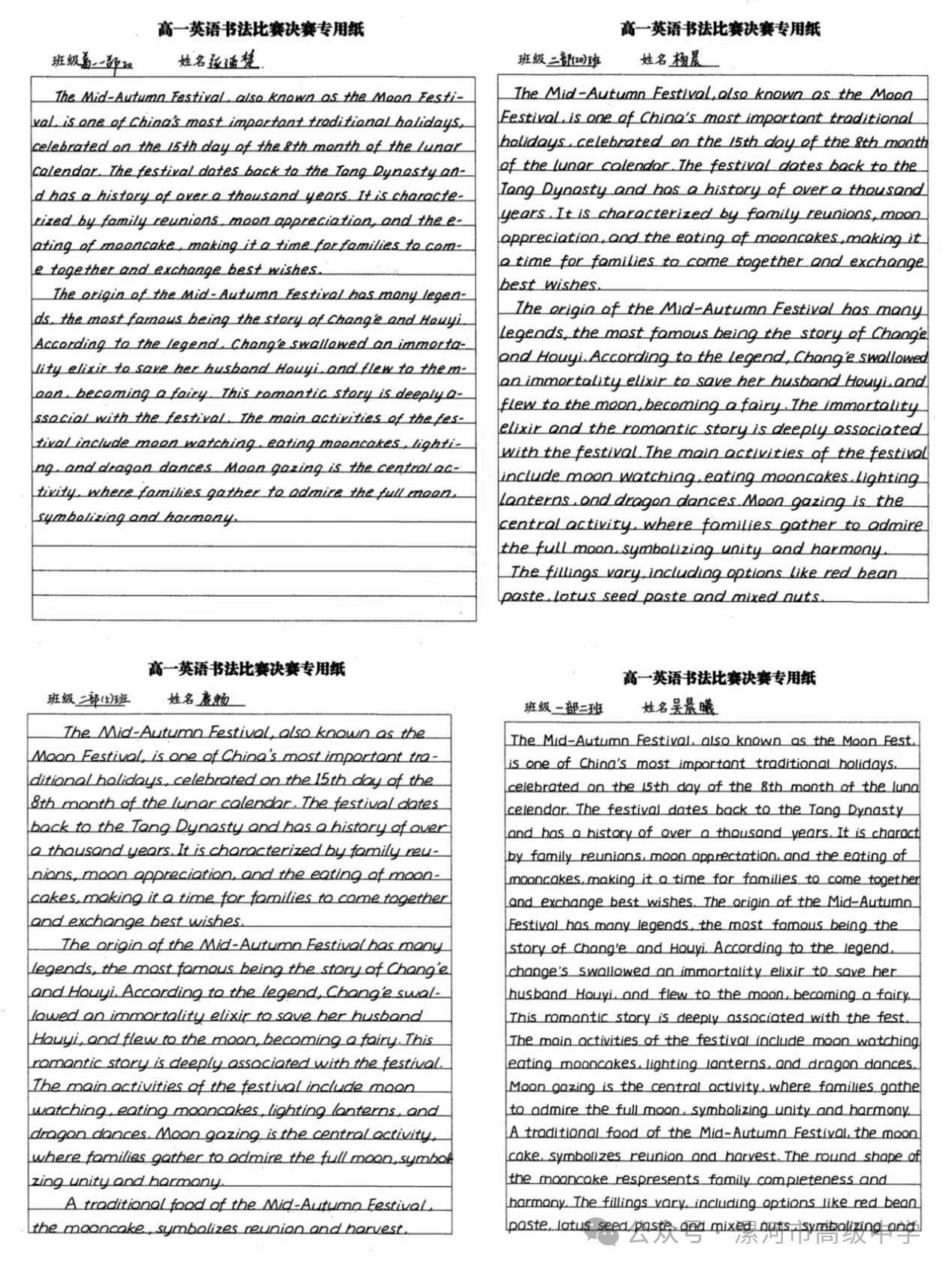 9月23日中午,决赛在三号楼北四楼东一教室举行。参赛学子自带笔墨,学校统一提供纸张。赛场内安静肃穆,唯有笔尖与纸张摩擦的沙沙声,宛如一曲轻柔的背景乐。参赛学子坐姿端正,全神贯注,力求每一个字母的圆润饱满,每一处连笔的流畅自然,每一行间距的均匀得体。有的字体圆润工整,尽显端庄秀丽;有的笔锋犀利,透露出洒脱与个性。短短二十分钟内,一幅幅布局合理、卷面整洁、风格统一的优秀作品便跃然纸上,充分展示了漯高学子扎实的英文书写基本功和良好的审美素养。