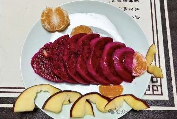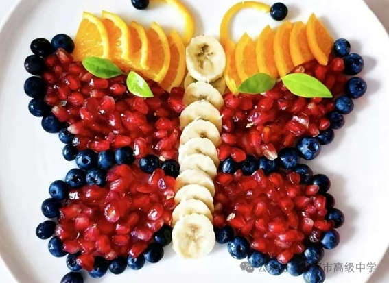 新鲜蔬果在学子手中褪去本貌,化作中秋图景里的生动元素。“月蝶映秋”作品中,蓝莓轻点边角、石榴籽铺展底色,香蕉片与橙子拼出振翅蝴蝶,似在月色下翩跹;“吉灯挂枝”则以海苔片为枝、橘子块为灯、胡萝卜片为穗、葡萄为叶,将中秋挂灯庆团圆的场景凝于盘中;“梅月相映”更显雅致,黄瓜条作枝干、石榴籽为梅花、香蕉为明月,勾勒出“月满枝头”的诗意;“锦鱼畅游”亦独具巧思,鲜红火龙果肉作鱼身、橙色橘子块为鱼鳍、雪白苹果块为鱼尾,余下苹果小块散作浪花,仿佛锦鲤在碧波中自在游弋,为中秋增添灵动生机。