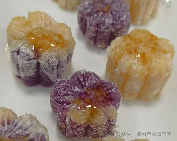 以米面为原料,学子将团圆意趣融入传统主食与糕点。“桂蜜梅酥冰皮糕”造型精巧,梅花状的冰皮裹着清甜的红薯或南瓜内馅,表层淋上晶莹的桂花蜜,紫黄相间的色泽与桂香交融,既是对中秋“赏桂品糕”传统的呼应,更显学子手工巧思;“团圆杂粮卷”则用糯米混合杂粮,包裹枣泥馅,切段后切面如小月亮,藏着阖家团圆的期许,让家常美味成为节日里的劳动献礼。