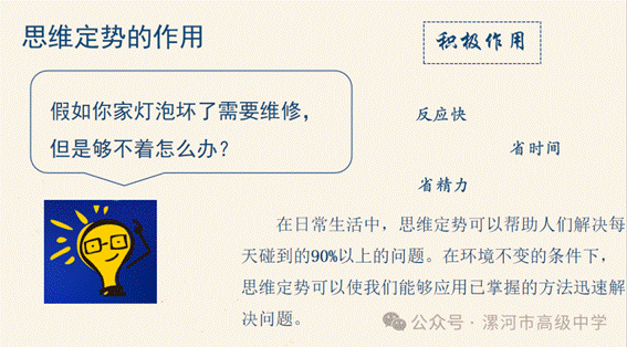 讨论中,大家认识到,思维定式犹如一把双刃剑:其积极作用在于,在面对常规问题时,它能帮助我们凭借经验快速反应,提高效率;但其消极影响在于,在需要创新突破的情境下,它极易固化为一种思维枷锁,阻碍新思路的产生。这一环节的核心目的,正是让学生完成对自身思维模式的元认知觉察——看见那堵“墙”,是推倒它的第一步。