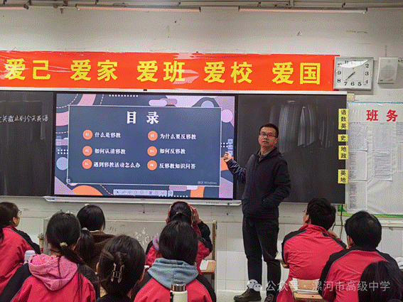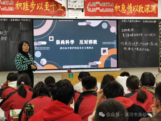 为进一步增强学生法治意识和识邪辨邪防邪反邪的意识,筑牢校园反邪教思想防线,10月20日晚7时,漯河市高级中学统一组织各班召开“崇尚科学,反对邪教”维护国家安全主题班会。此次班会旨在教育引导学生深刻认清邪教本质,自觉抵制邪教侵蚀,树立科学理性的世界观和人生观。