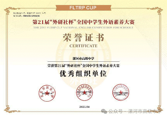 近日,第21届“外研社杯”全国中学生外语素养大赛传来捷报——漯河市高级中学凭借卓越的组织能力与亮眼的参赛成绩,荣获“优秀组织单位”称号!本届大赛,漯河高中展现出强劲的外语教学底蕴:1322名学生踊跃参赛,464人成功晋级省复赛,最终38人获得省一等奖、18人获得省二等奖、13人获得省三等奖、1人获得省优秀奖的优异成绩。其中,乔祎同学一举夺得全国一等奖,缑芮含同学斩获全国三等奖,为学校赢得全国性荣誉!
