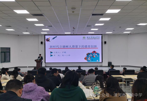 高一年级二部卢鹏老师展示的主题是“新时代立德树人背景下的德育创新”,他围绕德育中六重六轻的工作问题,分享自己在班级管理工作中的感悟。