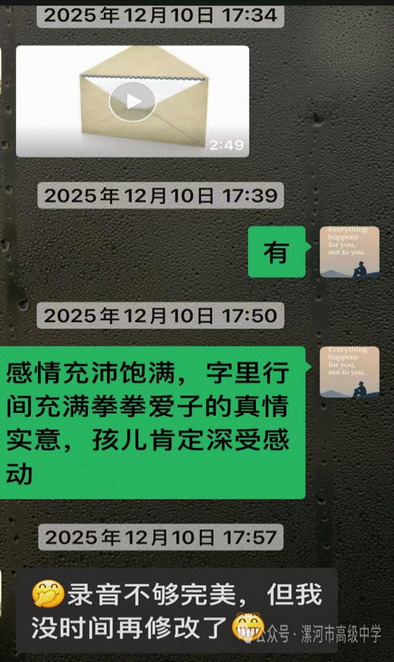 家校共育的深度,往往取决于情感连接的宽度。11月份阶段性检测之后,我尝试打破“成绩通报—问题反馈”的惯性通道,给家长们布置了一份特殊的“作业”:请为孩子录制一段“视频或者语音家书”。要求很简单:选择一个安静的时刻,面对镜头,说那些平时可能没机会说,或者不知如何开口的话——可以是记忆深处关于孩子的一个温暖片段,可以是自己年轻时的一个遗憾或梦想,甚至可以是对孩子未来生活的平凡祝愿。