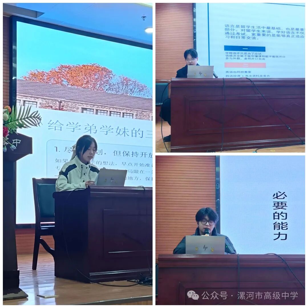 往届优秀毕业生的分享环节让现场氛围愈发热烈。漯河高中中韩班2023届毕业生李雨航,2024届毕业生田新鑫、赵锦洋三位同学,以亲身经历生动讲述了韩国留学生活的点滴。他们从课堂学习、社团活动、生活适应等方面展开分享,详细介绍了如何快速融入韩国校园文化、平衡学业与生活。在韩语学习经验分享中,三位同学毫无保留地分享了词汇积累、口语练习的实用方法,强调了国内阶段打好语言基础的重要性,并鼓励学弟学妹们主动交流、勇敢尝试。真实的案例、真挚的建议让家长们对孩子未来的留学生活有了更直观的认识。