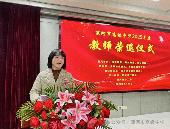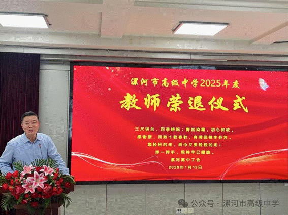 1月13日,漯河高中隆重举行2025年度教师荣退仪式,以温情而庄重的方式,为董艳丽、申凌云、陈吉龙等荣退教师送上真挚感谢与美好祝福。仪式由学校党委副书记陈爱红主持,学校领导班子成员、中层干部、各处室教师代表齐聚一堂,现场暖意融融,情谊深切。