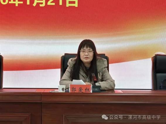 最后,郭爱红就本学期教育教学工作发表总结讲话。她全面回顾了2025年作为漯河市高级中学二次创业“团结奋斗年”取得的各项成就,推动一校三区联动发展成效显著。本学期围绕教师培养、教研提质、常规落实和班主任队伍建设四大核心工作,通过多元活动推动教学工作规范化、精细化、特色化发展,构建起教学与德育协同发力的育人格局。她强调,教育的本质在于“看见”,要紧扣“准、透、活、实、新、趣、效、思”八字要诀,打造品质高效课堂。针对青年教师成长,她提出要将“传帮带”从选做题转为必答题,师傅需切实扛起责任,助力青年教师快速成长。最后,她寄语全体教职工在新的一年里要深耕工作、经营生活、守护健康、滋养爱好,在教育之路上收获温暖与幸福。