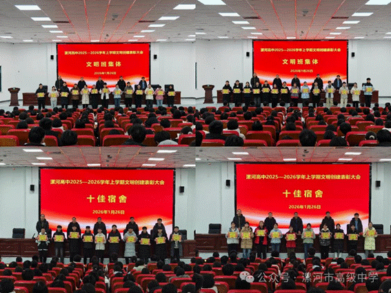 为深入贯彻落实立德树人根本任务,全面提升漯高学子文明素养,凝聚二次创业奋进力量,营造积极向上、文明和谐的校园氛围,持续深化文明校园创建成果。1月30日,漯河市高级中学高一年级在西校区阶梯教室隆重召开2025-2026学年上学期文明创建工作总结暨表彰大会。学校党委委员、副校长周振江,党委委员、副校长柳荣军,教务一处主任、高一年级一部主任康磊,总务处副主任、高一年级二部主任张永辉等出席会议。会议由政教处副主任王二伟主持。文明班集体班长、文明标兵代表、及全体寝室长齐聚一堂,共同见证荣誉时刻。
