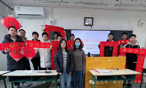 2026年2月3日,漯河高中书法教室内墨香四溢,红纸铺展。在学校书法社团辅导老师李皓、王亚飞、范亚齐的组织下,一场以“迎新春·写春联”为主题的传统文化实践活动正热烈展开。二十余名社团成员齐聚一堂,以笔为媒,以墨为介,亲手书写对新年的美好祝愿。