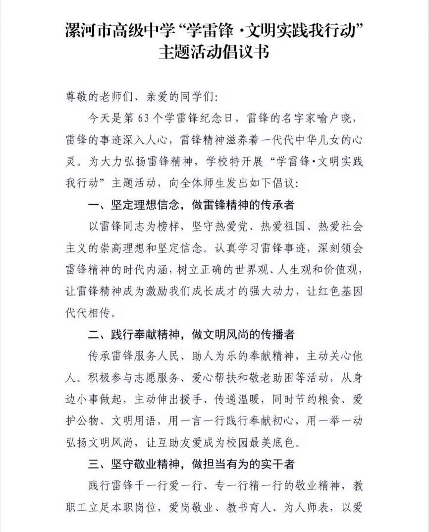 此次“学雷锋·文明实践我行动”主题活动的开展,不仅增强了全校师生对雷锋精神的认识,而且营造了人人学雷锋、处处见文明、时时有善举的浓厚氛围。未来,漯河市高级中学将持续推动学雷锋活动常态化、长效化,把雷锋精神融入立德树人全过程,引导师生用实际行动弘扬雷锋精神。 撰稿:许阿润 审核:康磊 李文斌 终审:陈爱红