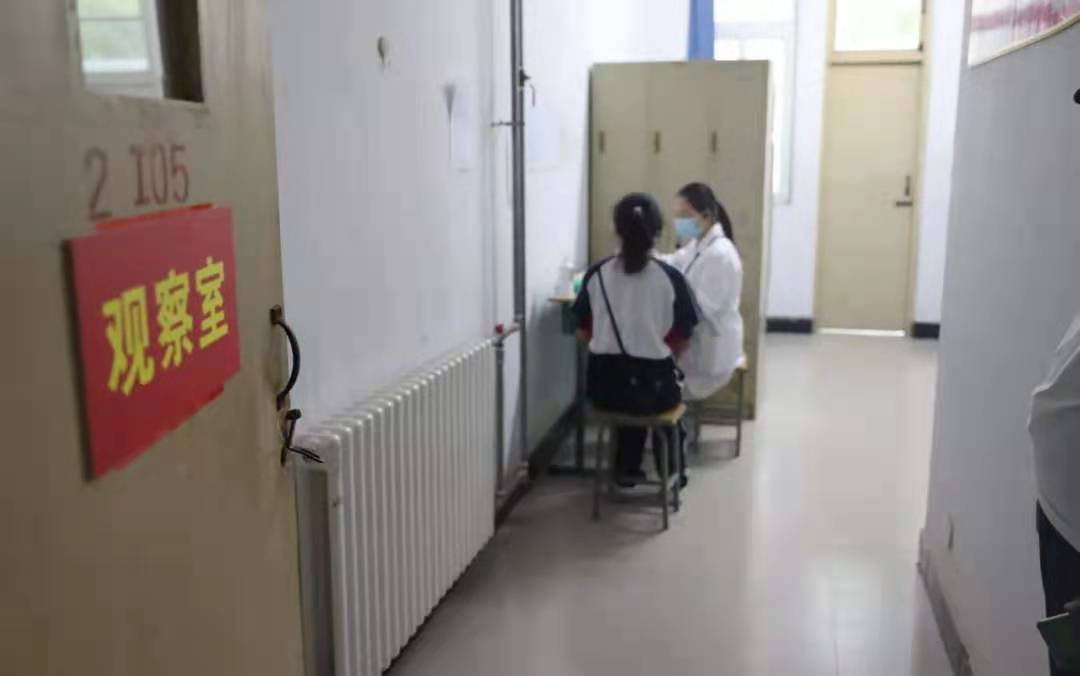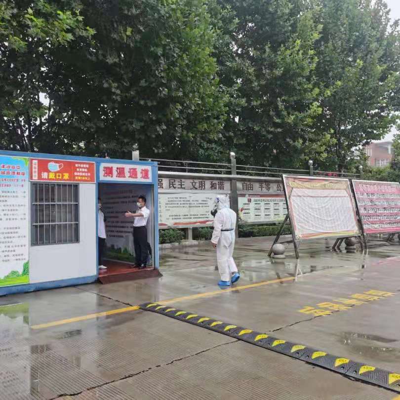 学校大门是疫情防控的第一道防线,至关重要。“学生”按要求佩戴口罩,一码一卡,一米间隔,有序步入测温通道,接受防疫人员行李消杀。测温中,突发有“学生”温度异常,值班老师予以拦截,暂停入校。应急值班老师询问其姓名、班级,并引导发热“学生”到观察室隔离区域。值班医生王宁按防疫要求询问该生近况,科学研判,如有异常,首先上报学校相关领导,并拨打120接诊,接着上报郾城区疾控中心、郾城区卫健委和郾城区教育局。
