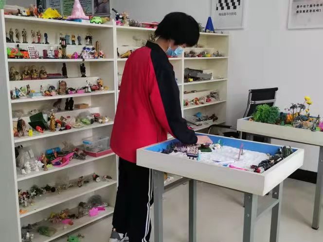 图为心理教师使用沙盘疗法,帮助同学们疗愈因疫情而焦灼的内心。