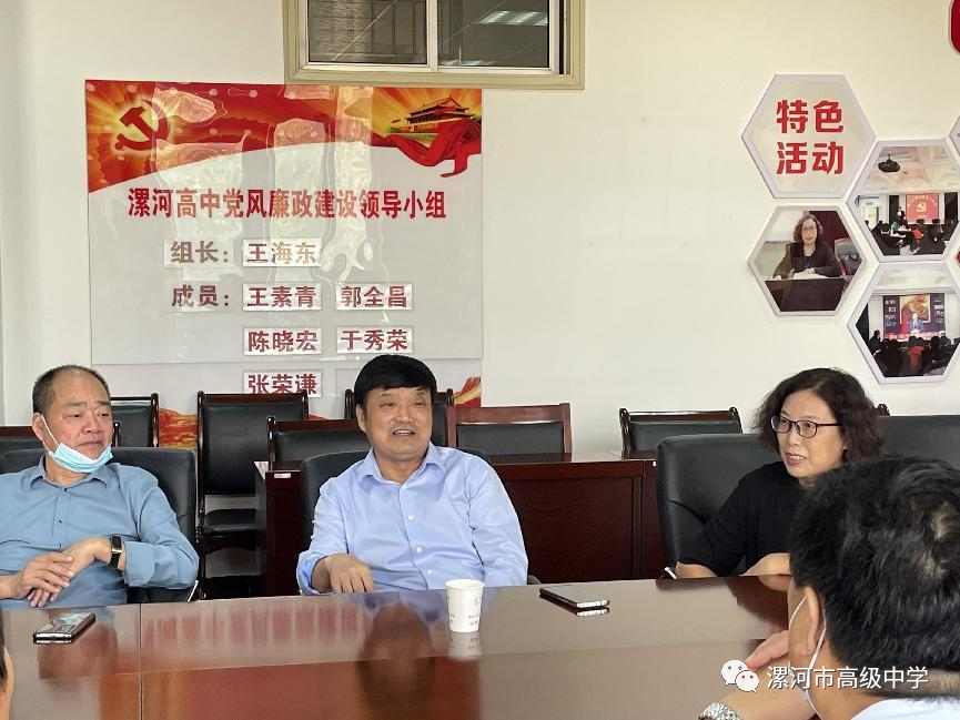 一段支教路,一生支教情。2022年9月21日上午,舞阳县莲花镇一中学校领导及教师代表前来漯河高中看望并为在此支教一年的两位教师张少强和赵晓嫔送来锦旗。漯河高中党委书记、校长王海东,党委副书记王素青,党委委员、副校长郭全昌,政教处主任、高三年级主任夏家海亲切接待了他们一行,并举行了温馨的座谈会。