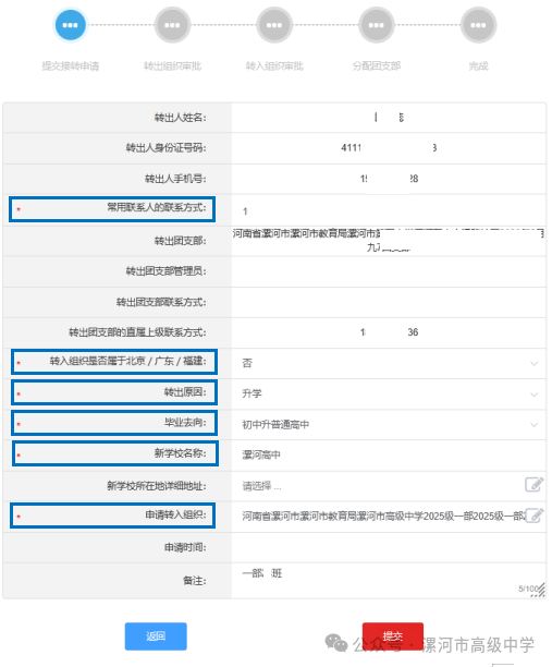 2.申请转出团员组织关系时,须经转出团支部(即原所在初中学校)网上审核同意后方可转出。学生在提交转出申请前,务必牢记转出团支部名称、联系电话,以及转出团支部直属上级联系电话。转出申请提交后,请及时与转出组织负责人联系,以便转出学校能及时审批。