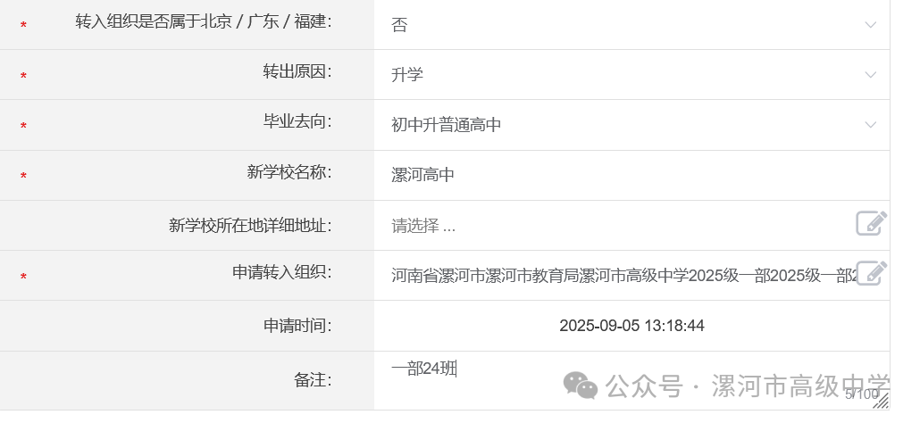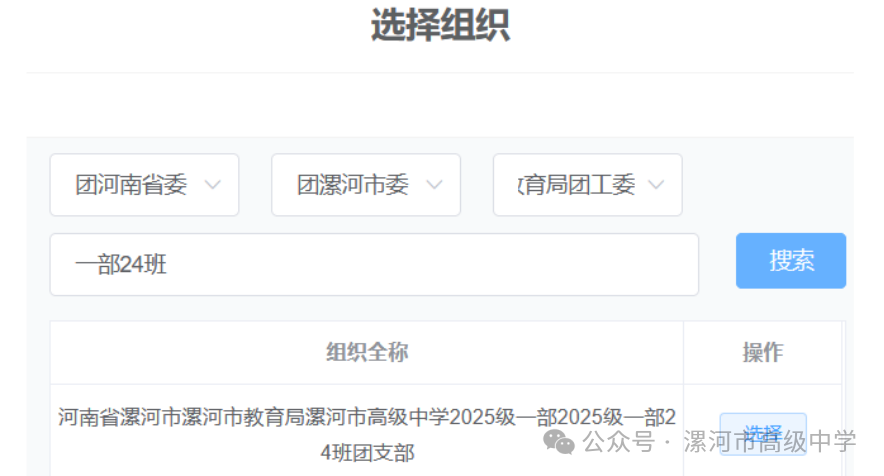 ⑤“申请转入组织”——第一行三个空依次选择:团河南省委,团漯河市委,漯河市教育局团工委;第二行根据自己实际班级输入:一部/二部*班(班级号为阿拉伯数字,例如:一部1班,二部1班),搜索,选择。
