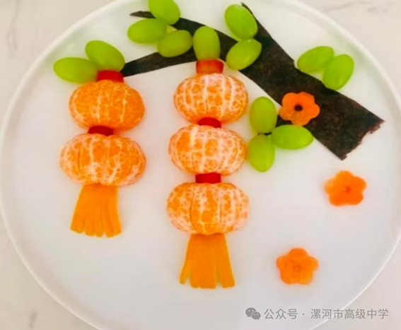 新鲜蔬果在学子手中褪去本貌,化作中秋图景里的生动元素。“月蝶映秋”作品中,蓝莓轻点边角、石榴籽铺展底色,香蕉片与橙子拼出振翅蝴蝶,似在月色下翩跹;“吉灯挂枝”则以海苔片为枝、橘子块为灯、胡萝卜片为穗、葡萄为叶,将中秋挂灯庆团圆的场景凝于盘中;“梅月相映”更显雅致,黄瓜条作枝干、石榴籽为梅花、香蕉为明月,勾勒出“月满枝头”的诗意;“锦鱼畅游”亦独具巧思,鲜红火龙果肉作鱼身、橙色橘子块为鱼鳍、雪白苹果块为鱼尾,余下苹果小块散作浪花,仿佛锦鲤在碧波中自在游弋,为中秋增添灵动生机。
