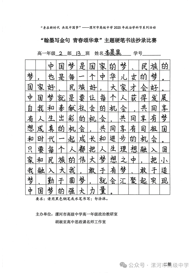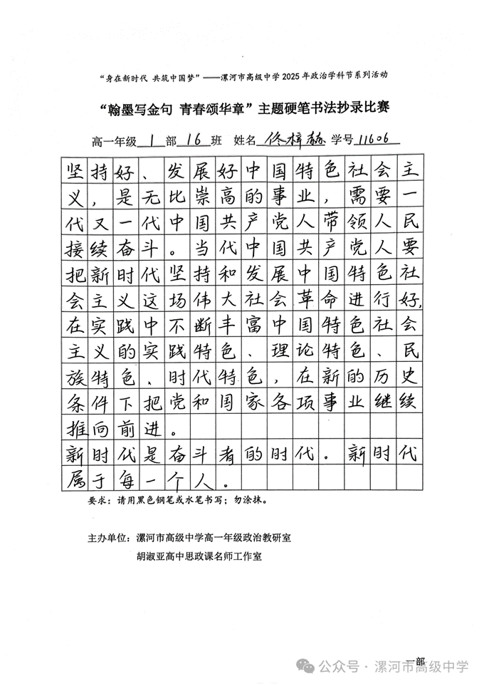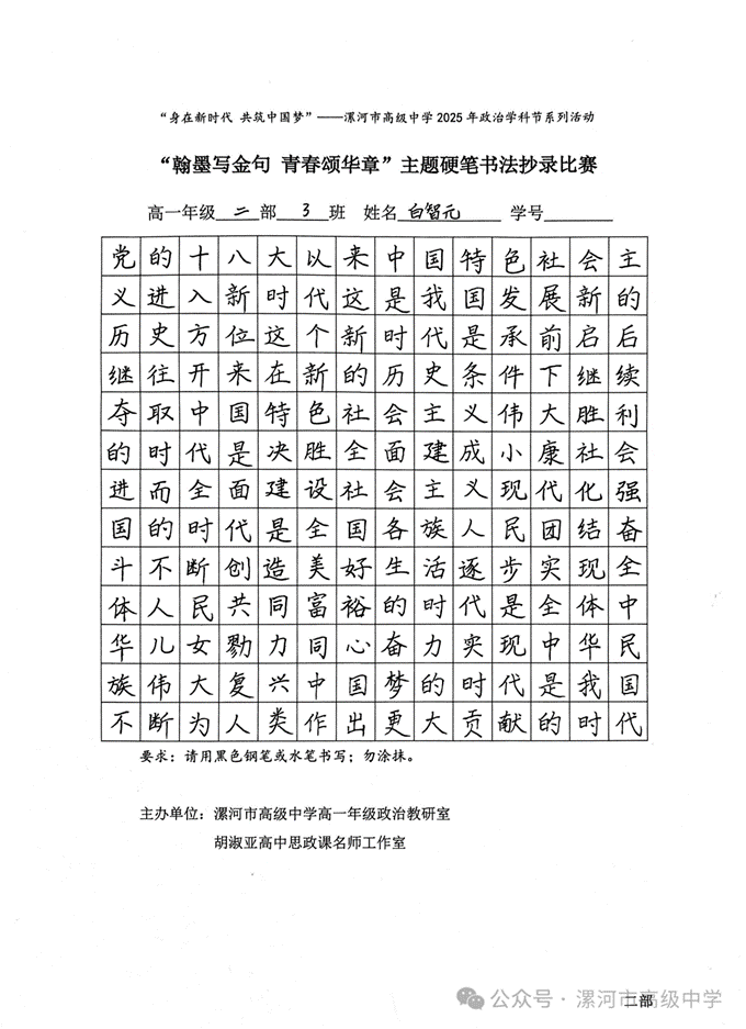 金秋送爽,翰墨飘香。为引导高一学生深学细悟习近平新时代中国特色社会主义思想,夯实理论根基,培养家国情怀,漯河市高级中学于近日举办了以“身在新时代,共筑中国梦”为主题的高一政治学科节。本次活动由高一政治学科组和思政课名师工作室精心策划,以“写、观、赛”为主线,融合书法、观影、知识竞赛等多种形式,让学生在参与中感悟,在体验中成长。