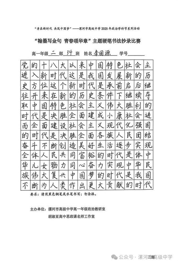 至此,漯河高中高一政治学科节已圆满落幕。本次政治学科节通过系列化、沉浸式的活动设计,实现了知识传授、能力培养与价值引领的有机统一。学生们在书写中沉淀了思想,在观影中陶冶了情操,在竞赛中巩固了学识,进一步坚定了“强国有我”的信念与决心。未来,漯河高中政治教研组将继续创新思政教育载体,丰富育人路径,引导广大学子在新时代的征程上勇担使命,为实现中华民族伟大复兴的中国梦贡献青春力量。