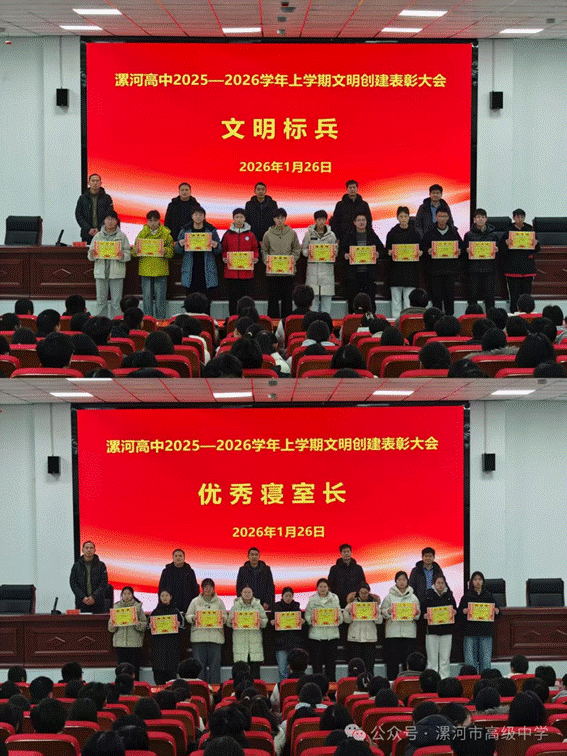 随后,康磊、张永辉分别宣读高一年级一部、二部“文明班集体”“十佳宿舍”及“优秀寝室长”的表彰名单。一部2班、二部5班等27个班级荣获“文明班集体”称号,谢心扬等660名同学获评“文明标兵”称号;一部18班108寝室、二部17班103寝室等40个宿舍获评“十佳宿舍”,一部18班芮康乐等140名同学获评“优秀寝室长”。一份份名单的宣读,既是对获奖集体与个人辛勤付出的肯定,更是对全体漯高学子践行文明、追求卓越的号召。