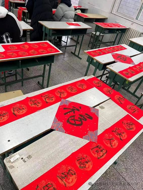讲解结束后,同学们纷纷提笔实践。活动现场,同学们或独自凝神创作,或三五成群交流技巧。红纸上的墨迹逐渐增多,一幅幅充满青春气息又不失传统韵味的春联铺满教室。