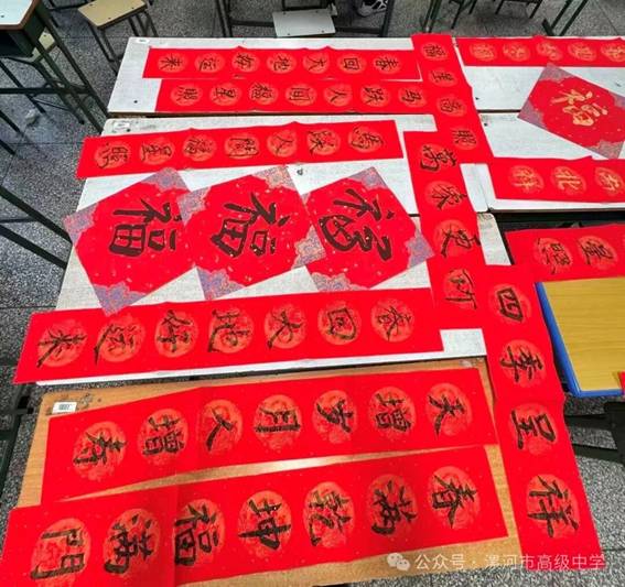 二、创意融合,古今对话 同学们屏息悬腕,以笔为引,将马年的朝气凝于毫端。一幅“马跃人间福星照”跃字末笔如骏骥腾跃,气势昂扬;另一联“马到成功宏图展”,墨迹酣畅,尽显少年锐气。指导老师从旁解说“马”字笔画的力道与节奏,同学们在挥洒间,不仅体味着书法韵律,更表达了对马年新春的美好愿景。 除了传统春联,一些同学还尝试了创新表达。书法社社长陈同学将校园元素融入创作:“书山有路勤为径,学海无涯苦作舟”被巧妙地改为“书山有路趣为径,学海无涯乐作舟”,体现了漯高学子独特的学习观。“我们不仅是在模仿传统,更是在与传统文化对话。”陈同学表示,“让春联贴近我们的生活,才能让传统真正活起来。” 三、成果展示,祝福传递 活动接近尾声时,同学们已完成几十幅春联作品。同学们相互欣赏、点评,选出最喜爱的作品进行集中展示。“这幅‘一帆风顺年年好,万事如意步步高’笔法稳健,寓意吉祥。”“我喜欢这副‘梅花香自苦寒来,宝剑锋从磨砺出’,很有我们高中生的精气神!”活动最后,同学们小心卷起自己最满意的作品,准备带回家中张贴,或者作为新春的祝福赠与亲友。红纸黑字间,流淌的是千年文化血脉,寄托的是青春真挚祝愿。 书法社的这场活动,以笔墨为桥梁,连接起传统与现代、文化与生活。在这个数字化的时代,亲手书写的过程本身就是一种珍贵的文化体验,让同学们在笔锋转折间,感受中华文化独有的温度与深度。正如一位参与同学在活动感言中所写:“我书写的不仅是春联,更是对传统文化的敬意,对新年的期盼,对成长的承诺。” 撰稿:李皓 审核:丁贺伟 马文杰 终审:夏家海 编辑:王怡婷