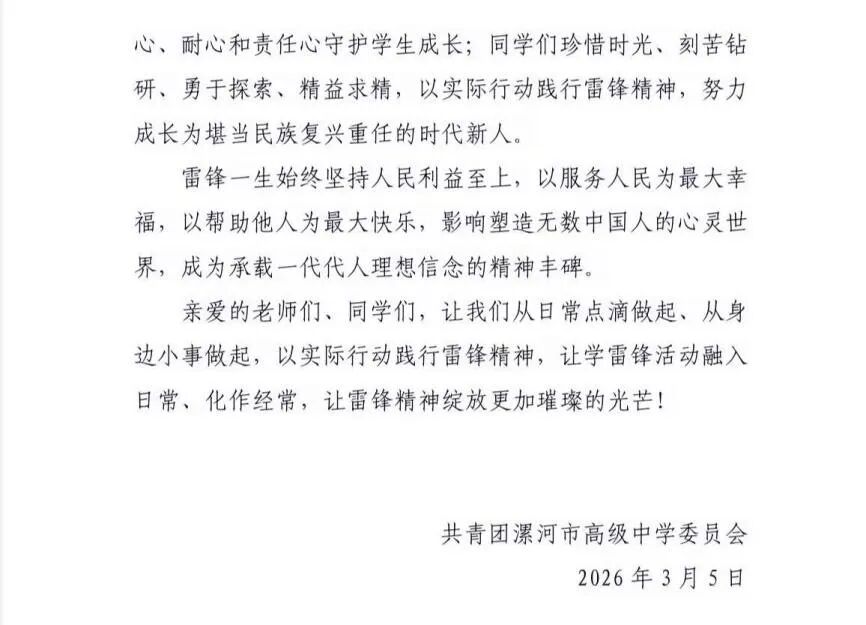 此次“学雷锋·文明实践我行动”主题活动的开展,不仅增强了全校师生对雷锋精神的认识,而且营造了人人学雷锋、处处见文明、时时有善举的浓厚氛围。未来,漯河市高级中学将持续推动学雷锋活动常态化、长效化,把雷锋精神融入立德树人全过程,引导师生用实际行动弘扬雷锋精神。 撰稿:许阿润 审核:康磊 李文斌 终审:陈爱红